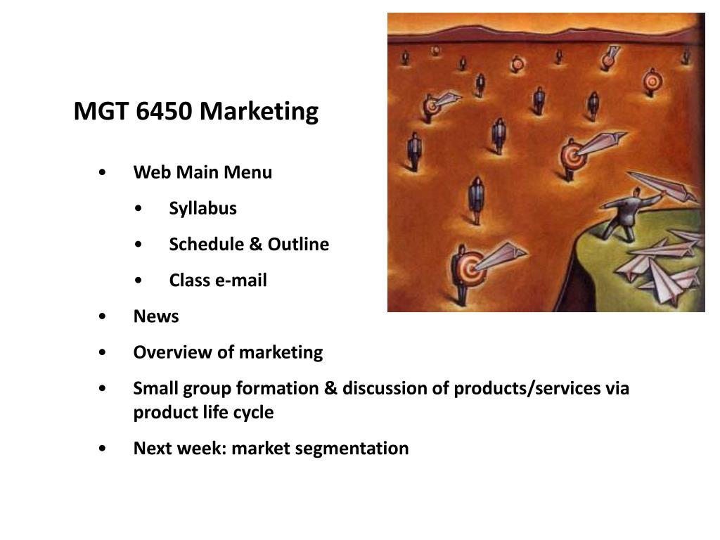 MGT 6450 Marketing • Web Main Menu • Syllabus • Schedule & Outline • Class e-mail • News • Overview of marketing • Small group formation & discussion of products/services via product life cycle • Next week: market segmentation