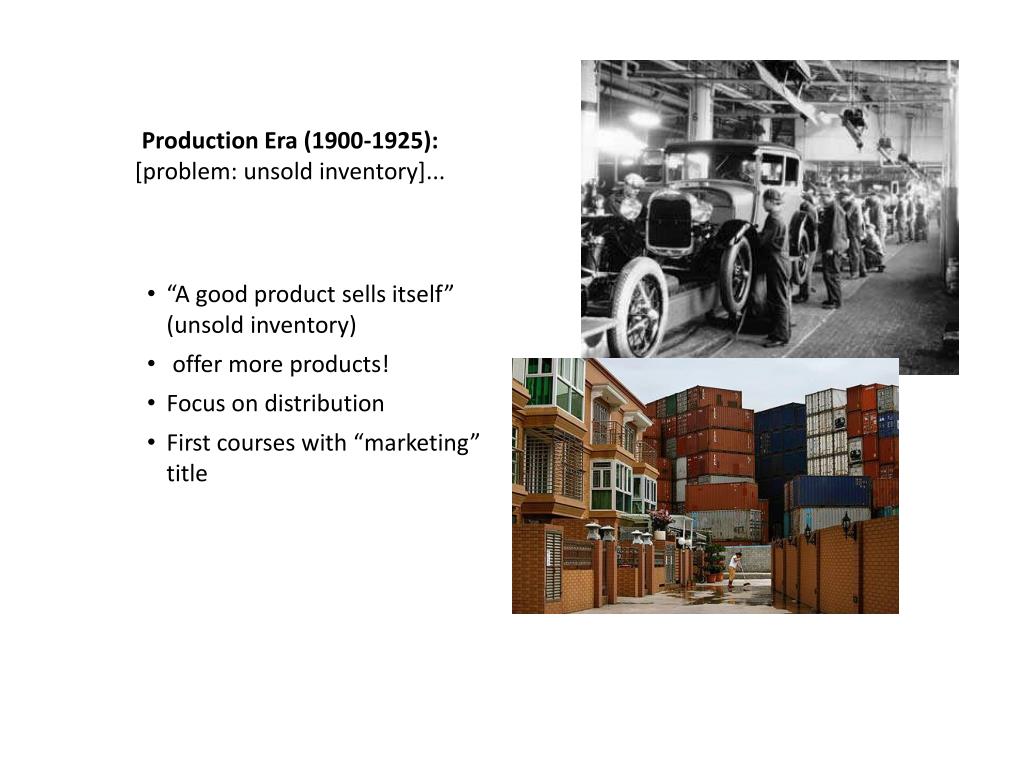 Production Era (1900-1925): [problem: unsold inventory]... • “A good product sells itself” (unsold inventory) • offer more products! • Focus on distribution • First courses with “marketing” title