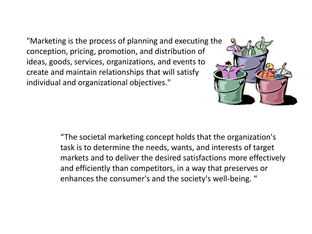 "Marketing is the process of planning and executing the conception, pricing, promotion, and distribution of ideas, goods, services, organizations, and events to create and maintain relationships that will satisfy individual and organizational objectives." “The societal marketing concept holds that the organization's task is to determine the needs, wants, and interests of target markets and to deliver the desired satisfactions more effectively and efficiently than competitors, in a way that preserves or enhances the consumer's and the society's well-being. “