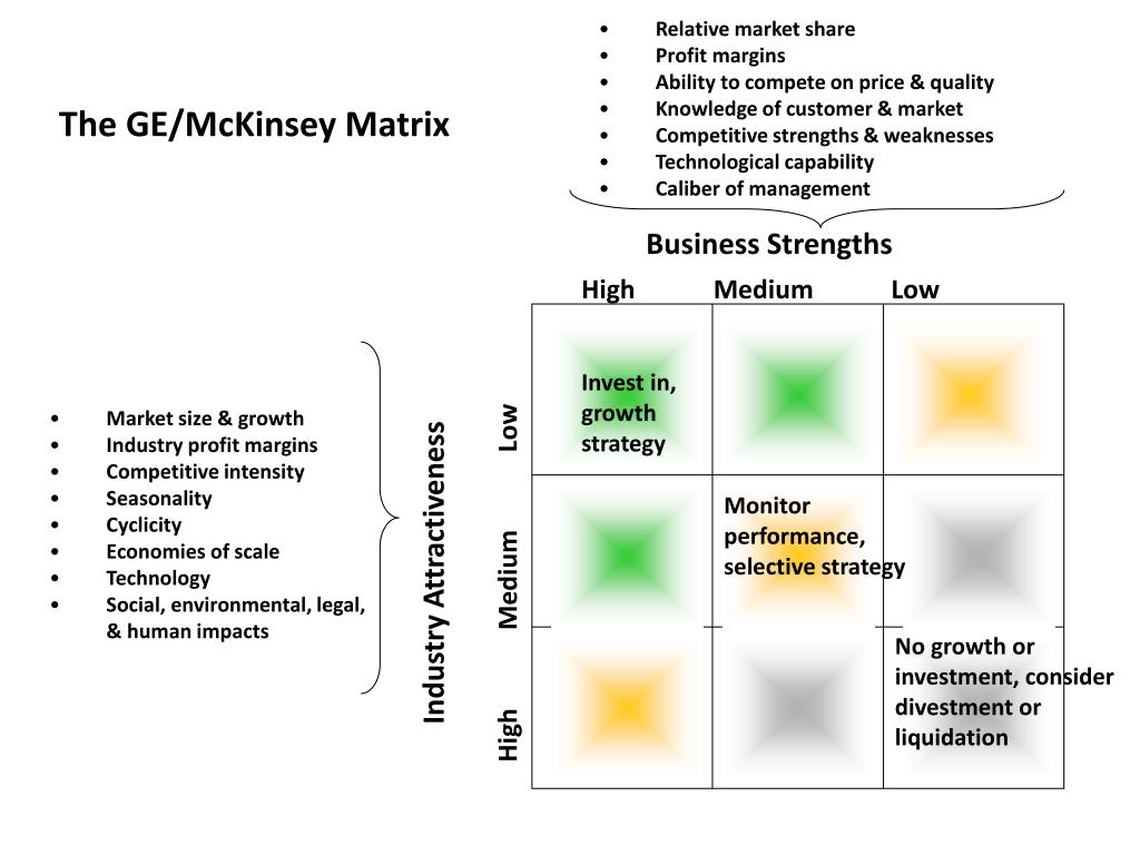 Relative market share • Profit margins • Ability to compete on price & quality • Knowledge of customer & market • Competitive strengths & weaknesses • Technological capability • Caliber of management The GE/McKinsey Matrix Business Strengths High Medium Low Invest in, growth strategy • Market size & growth • Industry profit margins • Competitive intensity • Seasonality • Cyclicity • Economies of scale • Technology • Social, environmental, legal, & human impacts Monitor performance, selective strategy Industry Attractiveness High Medium Low No growth or investment, consider divestment or liquidation