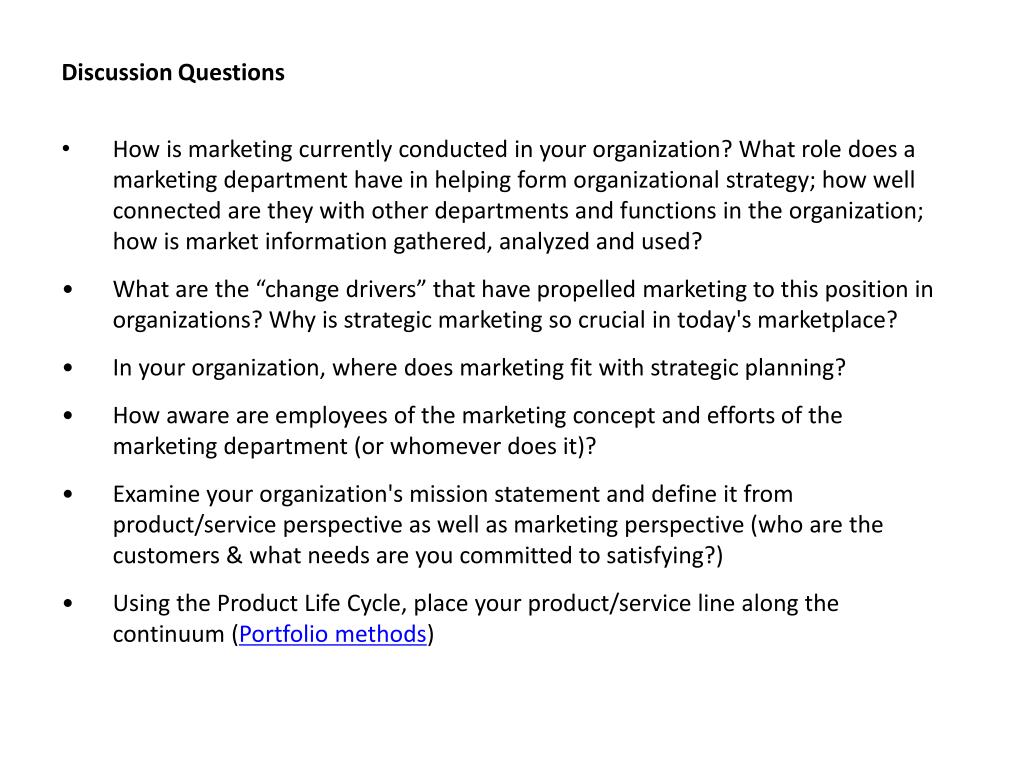 Discussion Questions • How is marketing currently conducted in your organization? What role does a marketing department have in helping form organizational strategy; how well connected are they with other departments and functions in the organization; how is market information gathered, analyzed and used? • What are the “change drivers” that have propelled marketing to this position in organizations? Why is strategic marketing so crucial in today's marketplace? • In your organization, where does marketing fit with strategic planning? • How aware are employees of the marketing concept and efforts of the marketing department (or whomever does it)? • Examine your organization's mission statement and define it from product/service perspective as well as marketing perspective (who are the customers & what needs are you committed to satisfying?) • Using the Product Life Cycle, place your product/service line along the continuum (Portfolio methods)