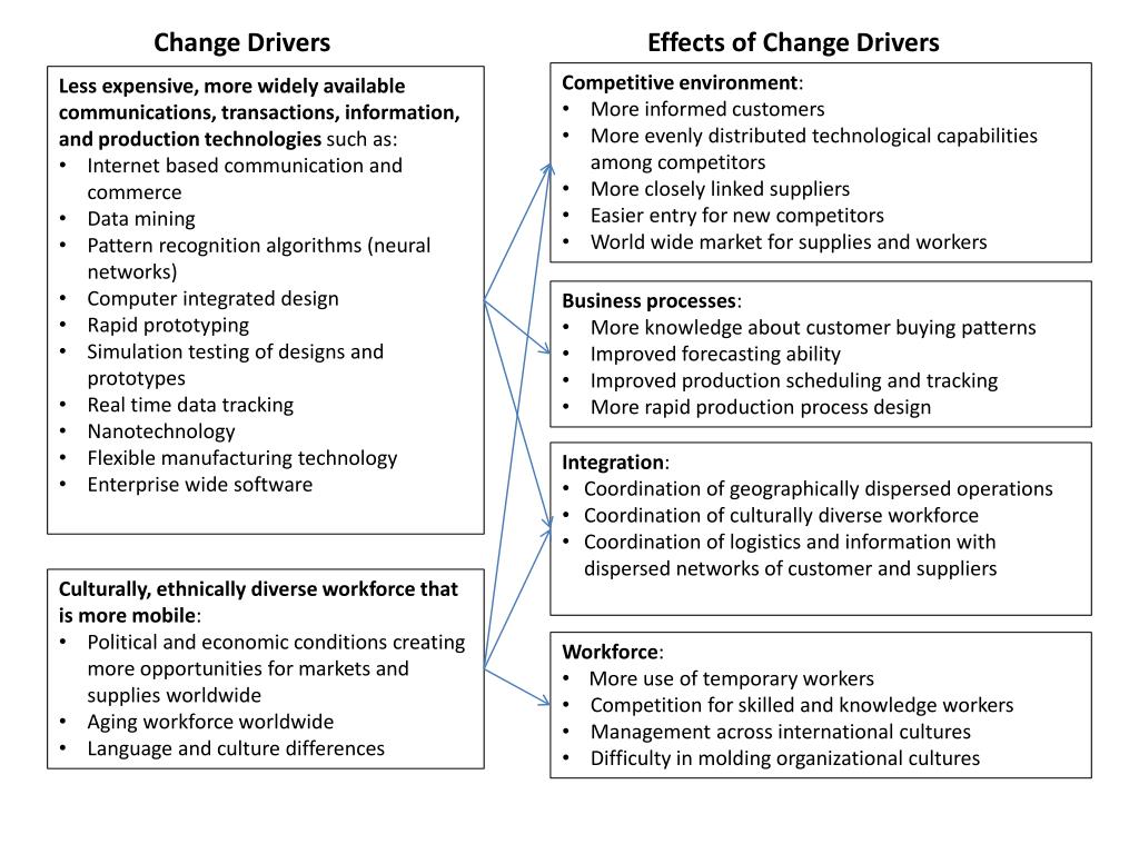 Change Drivers Effects of Change Drivers • Competitive environment: • More informed customers • More evenly distributed technological capabilities among competitors • More closely linked suppliers • Easier entry for new competitors • World wide market for supplies and workers • Less expensive, more widely available communications, transactions, information, and production technologies such as: • Internet based communication and commerce • Data mining • Pattern recognition algorithms (neural networks) • Computer integrated design • Rapid prototyping • Simulation testing of designs and prototypes • Real time data tracking • Nanotechnology • Flexible manufacturing technology • Enterprise wide software • Business processes: • More knowledge about customer buying patterns • Improved forecasting ability • Improved production scheduling and tracking • More rapid production process design • Integration: • Coordination of geographically dispersed operations • Coordination of culturally diverse workforce • Coordination of logistics and information with dispersed networks of customer and suppliers • Culturally, ethnically diverse workforce that is more mobile: • Political and economic conditions creating more opportunities for markets and supplies worldwide • Aging workforce worldwide • Language and culture differences • Workforce: • More use of temporary workers • Competition for skilled and knowledge workers • Management across international cultures • Difficulty in molding organizational cultures