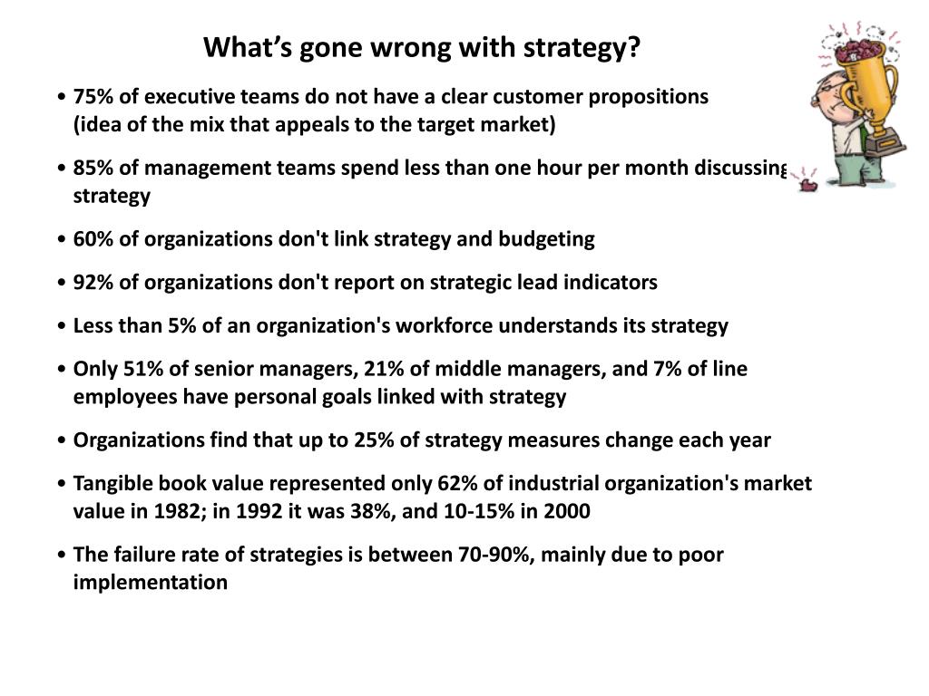 What’s gone wrong with strategy? • 75% of executive teams do not have a clear customer propositions (idea of the mix that appeals to the target market) • 85% of management teams spend less than one hour per month discussing strategy • 60% of organizations don't link strategy and budgeting • 92% of organizations don't report on strategic lead indicators • Less than 5% of an organization's workforce understands its strategy • Only 51% of senior managers, 21% of middle managers, and 7% of line employees have personal goals linked with strategy • Organizations find that up to 25% of strategy measures change each year • Tangible book value represented only 62% of industrial organization's market value in 1982; in 1992 it was 38%, and 10-15% in 2000 • The failure rate of strategies is between 70-90%, mainly due to poor implementation