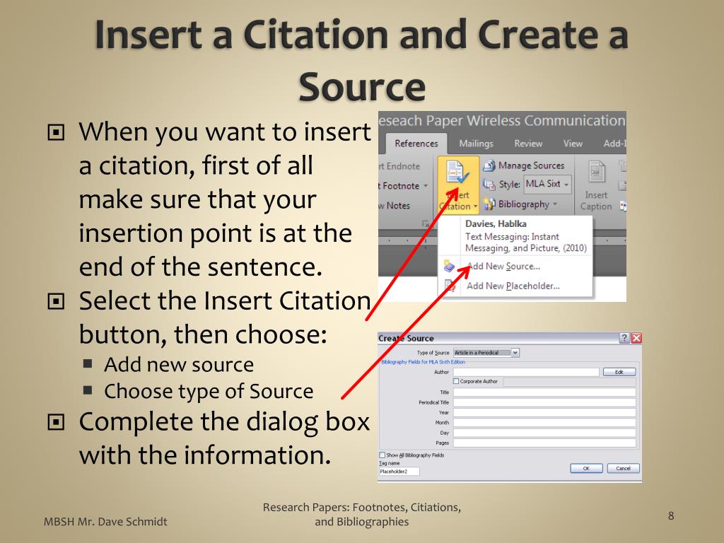 Utilizing Microsoft Word 2010 • Word provides tools to assist you in inserting citations in a paper and later generates a list of sources from the citations. • When a document style is selected, Word will automatically format the citations and list of sources. The process for adding citations in Word is as follows: • Modify the documentation style, if necessary. • Insert a citation placeholder. • Enter the source documentation Research Papers: Footnotes, Citiations, and Bibliographies