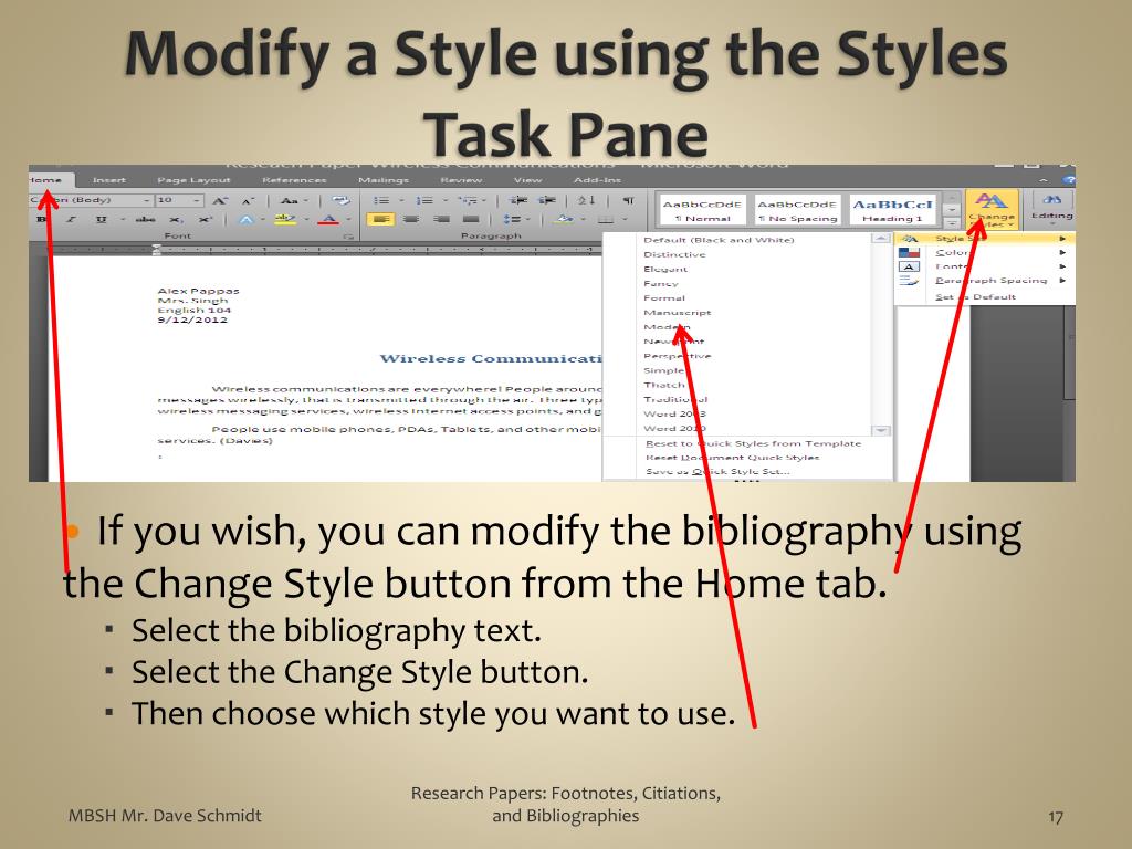 Modify a Style using the Styles Task Pane • If you wish, you can modify the bibliography using the Change Style button from the Home tab. • Select the bibliography text. • Select the Change Style button. • Then choose which style you want to use. Research Papers: Footnotes, Citiations, and Bibliographies