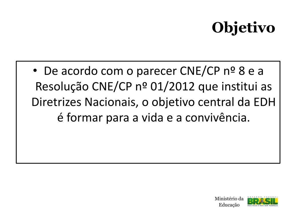 Ministério da Educação Objetivo • De acordo com o parecer CNE/CP nº 8 e a Resolução CNE/CP nº 01/2012 que institui as Diretrizes Nacionais, o objetivo central da EDH é formar para a vida e a convivência.