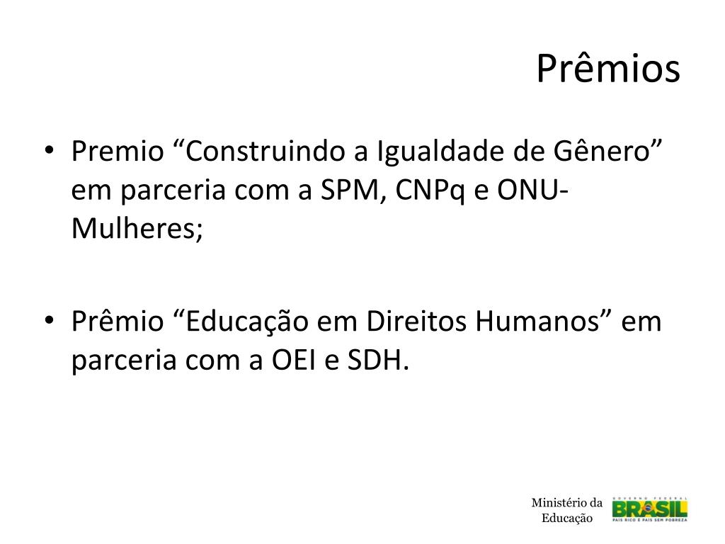 Ministério da Educação Prêmios • Premio “Construindo a Igualdade de Gênero” em parceria com a SPM, CNPq e ONU-Mulheres; • Prêmio “Educação em Direitos Humanos” em parceria com a OEI e SDH.