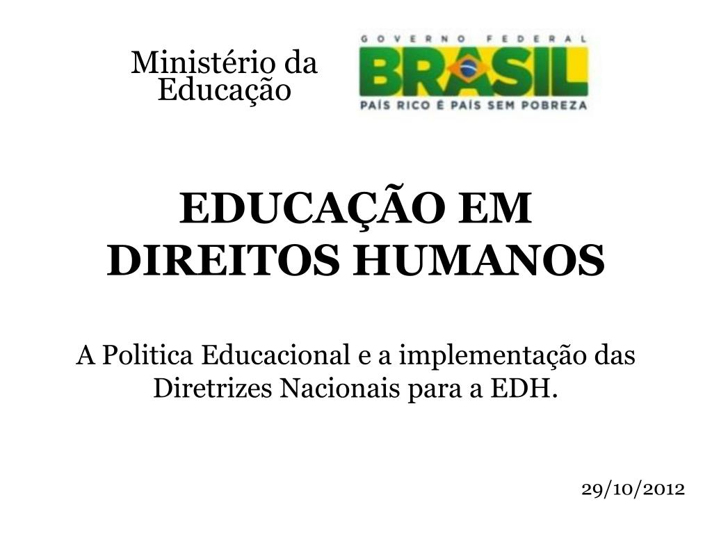 Ministério da Educação EDUCAÇÃO EM DIREITOS HUMANOSA Politica Educacional e a implementação das Diretrizes Nacionais para a EDH. 29/10/2012