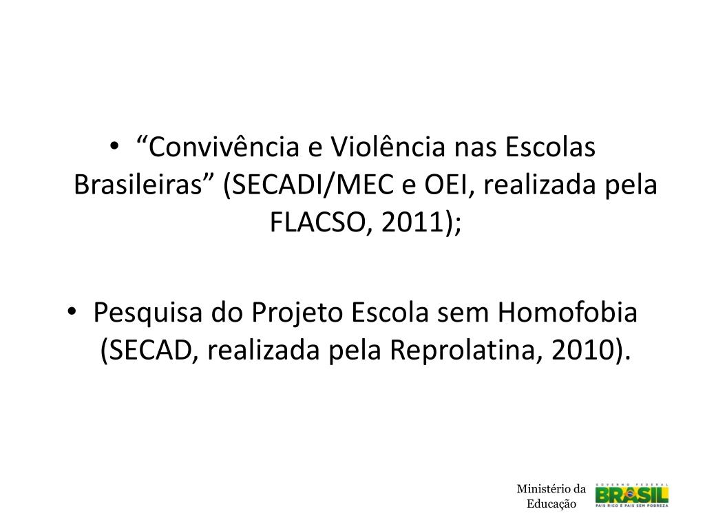 Ministério da Educação • “Convivência e Violência nas Escolas Brasileiras” (SECADI/MEC e OEI, realizada pela FLACSO, 2011); • Pesquisa do Projeto Escola sem Homofobia (SECAD, realizada pela Reprolatina, 2010).