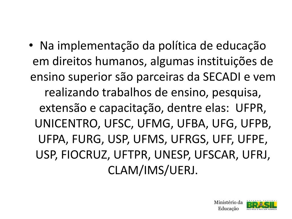 Ministério da Educação • Na implementação da política de educação em direitos humanos, algumas instituições de ensino superior são parceiras da SECADI e vem realizando trabalhos de ensino, pesquisa, extensão e capacitação, dentre elas: UFPR, UNICENTRO, UFSC, UFMG, UFBA, UFG, UFPB, UFPA, FURG, USP, UFMS, UFRGS, UFF, UFPE, USP, FIOCRUZ, UFTPR, UNESP, UFSCAR, UFRJ, CLAM/IMS/UERJ.