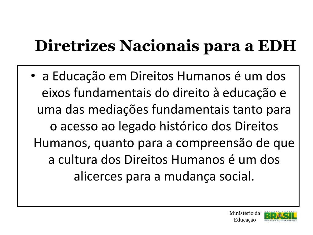 Ministério da Educação Diretrizes Nacionais para a EDH • a Educação em Direitos Humanos é um dos eixos fundamentais do direito à educação e uma das mediações fundamentais tanto para o acesso ao legado histórico dos Direitos Humanos, quanto para a compreensão de que a cultura dos Direitos Humanos é um dos alicerces para a mudança social.