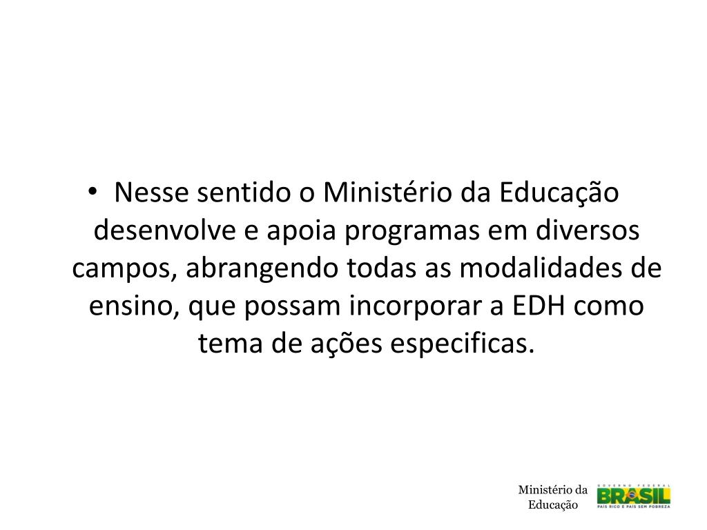 Ministério da Educação • Nesse sentido o Ministério da Educação desenvolve e apoia programas em diversos campos, abrangendo todas as modalidades de ensino, que possam incorporar a EDH como tema de ações especificas.