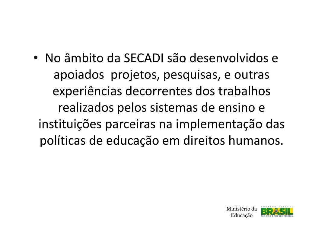 Ministério da Educação • No âmbito da SECADI são desenvolvidos e apoiados projetos, pesquisas, e outras experiências decorrentes dos trabalhos realizados pelos sistemas de ensino e instituições parceiras na implementação das políticas de educação em direitos humanos.