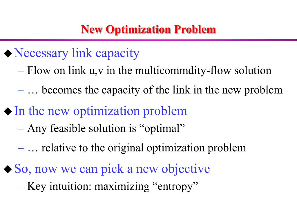New Optimization Problem • Necessary link capacity • Flow on link u,v in the multicommdity-flow solution • … becomes the capacity of the link in the new problem • In the new optimization problem • Any feasible solution is “optimal” • … relative to the original optimization problem • So, now we can pick a new objective • Key intuition: maximizing “entropy”