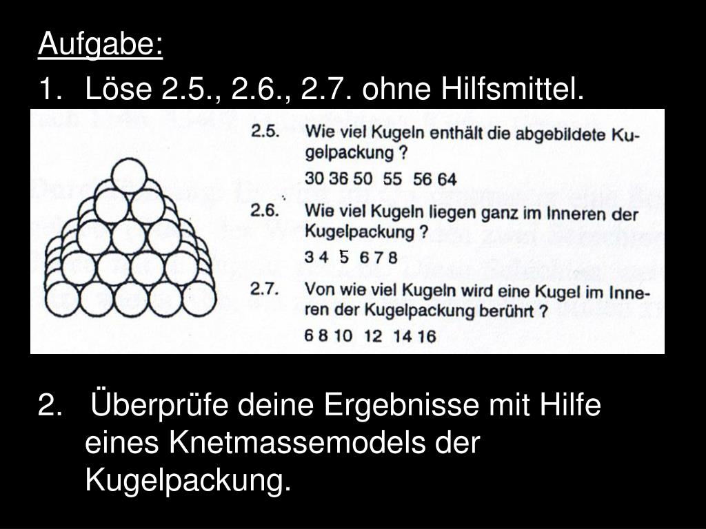 Aufgabe: • Löse 2.5., 2.6., 2.7. ohne Hilfsmittel. 2. Überprüfe deine Ergebnisse mit Hilfe eines Knetmassemodels der Kugelpackung.