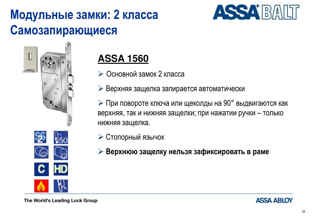 Модульные замки: 2 класса Самозапирающиеся • ASSA 1560 • Основной замок 2 класса • Верхняя защелка запирается автоматически • При повороте ключа или щеколды на 90° выдвигаются как верхняя, так и нижняя защелки; при нажатии ручки – только нижняя защелка. • Стопорный язычок • Верхнюю защелку нельзя зафиксировать в раме
