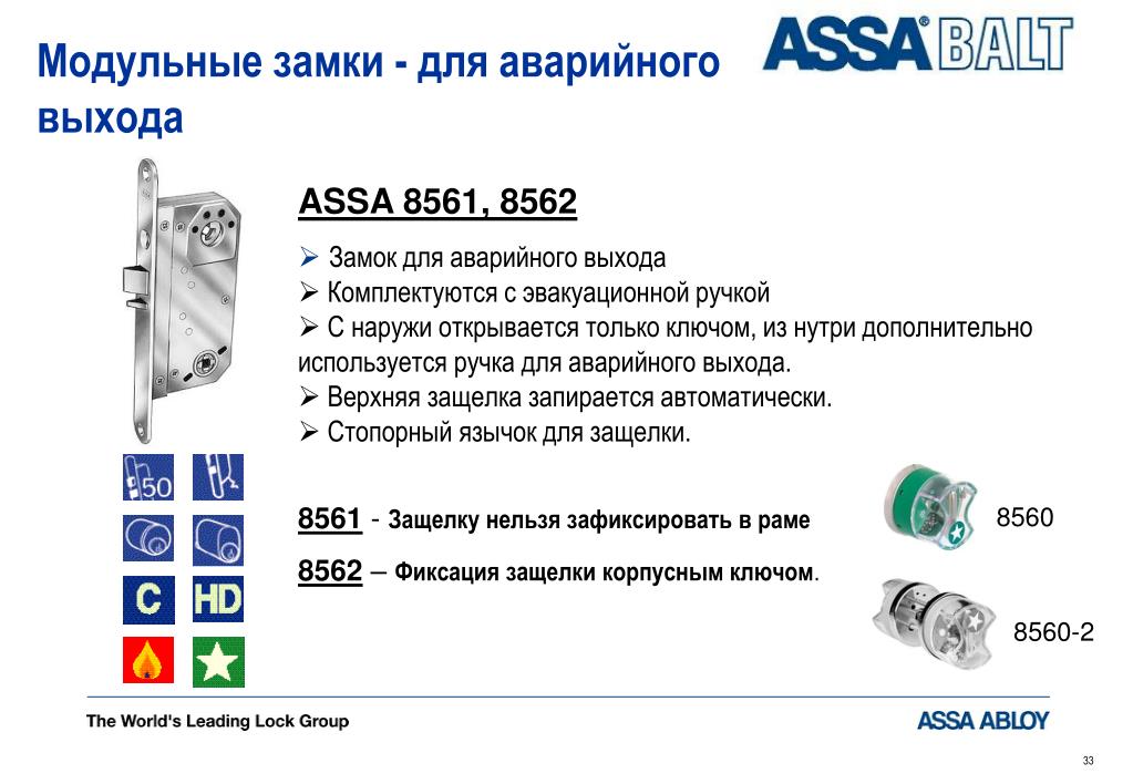 8560 8560-2 Модульные замки - для аварийного выхода • ASSA 8561, 8562 • Замок для аварийного выхода • Комплектуются с эвакуационнойручкой • С наружи открывается только ключом, из нутри дополнительно используется ручка для аварийного выхода. • Верхняя защелка запирается автоматически. • Стопорный язычок для защелки. 8561 - Защелку нельзя зафиксировать в раме 8562 – Фиксация защелки корпусным ключом.