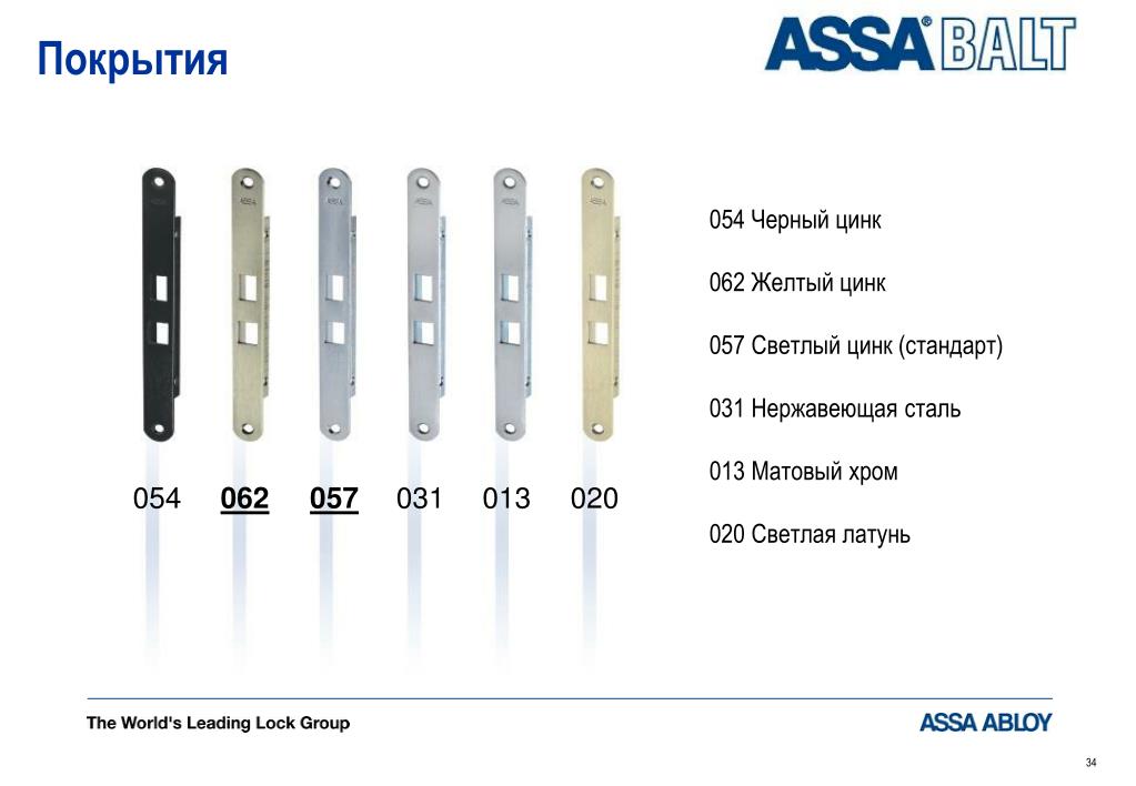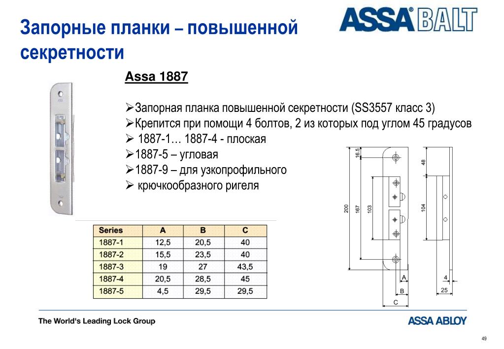 Запорные планки– повышенной секретности • Assa 1887 • Запорная планка повышенной секретности (SS3557 класс 3) • Крепится при помощи 4 болтов, 2 из которых под углом 45 градусов • 1887-1… 1887-4 - плоская • 1887-5 – угловая • 1887-9 – для узкопрофильного • крючкообразного ригеля