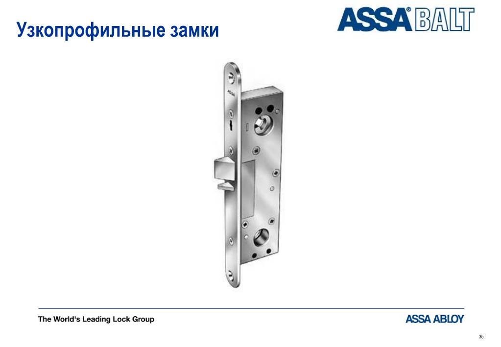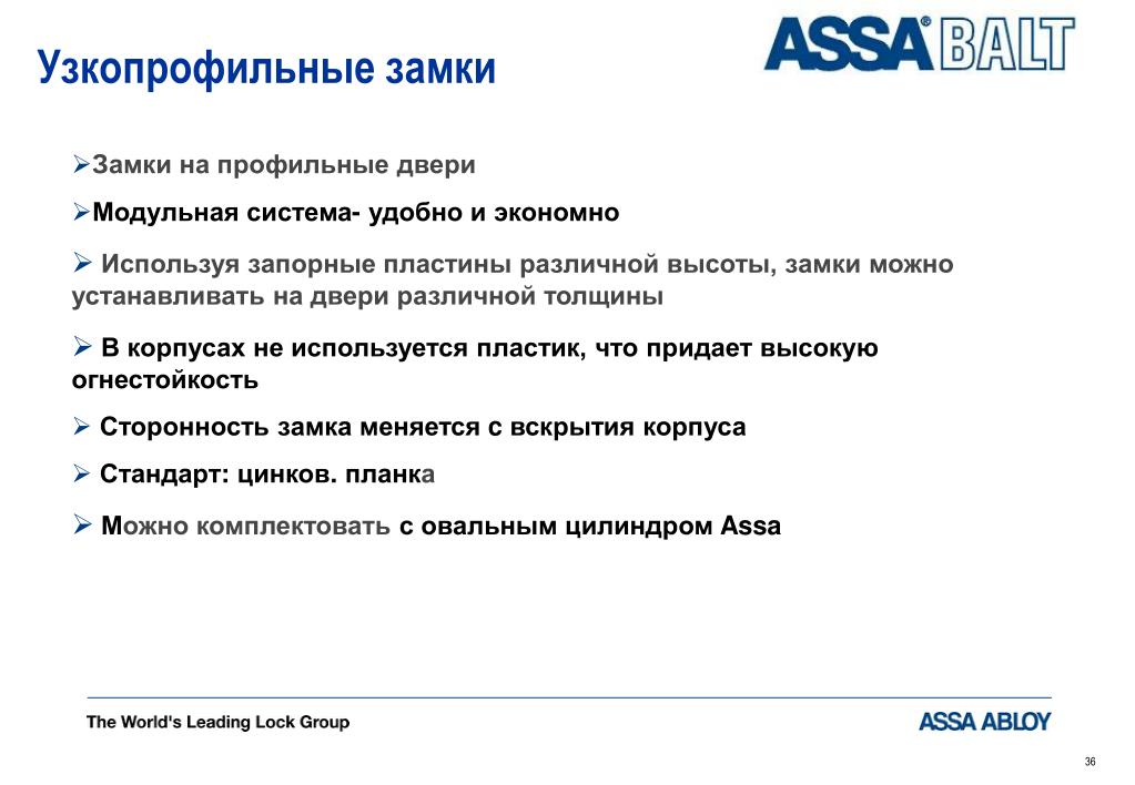 Узкопрофильные замки • Замки на профильные двери • Модульная система- удобно и экономно • Используя запорные пластины различной высоты, замки можно устанавливать на двери различной толщины • В корпусах не используется пластик, что придает высокую огнестойкость • Сторонность замка меняется c вскрытия корпуса • Стандарт: цинков. планка • Можно комплектовать с овальным цилиндром Assa