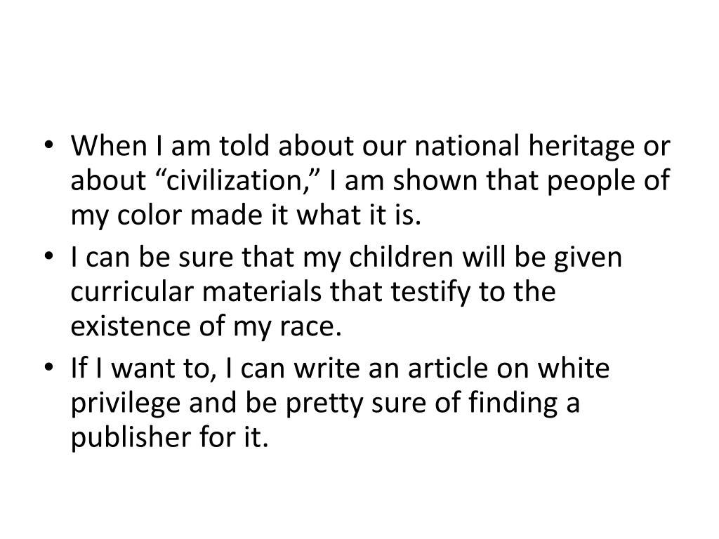 When I am told about our national heritage or about “civilization,” I am shown that people of my color made it what it is. • I can be sure that my children will be given curricular materials that testify to the existence of my race. • If I want to, I can write an article on white privilege and be pretty sure of finding a publisher for it.