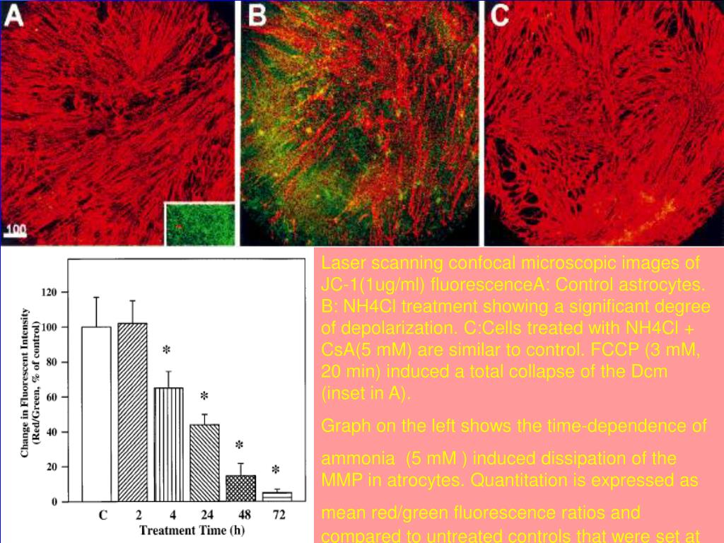 Laser scanning confocal microscopic images of JC-1(1ug/ml) fluorescenceA: Control astrocytes. B: NH4Cl treatment showing a significant degree of depolarization. C:Cells treated with NH4Cl + CsA(5 mM) are similar to control. FCCP (3 mM, 20 min) induced a total collapse of the Dcm (inset in A). Graph on the left shows the time-dependence of ammonia (5 mM ) induced dissipation of the MMP in atrocytes. Quantitation is expressed as mean red/green fluorescence ratios and compared to untreated controls that were set at 100%. *p<0.05 vs control.