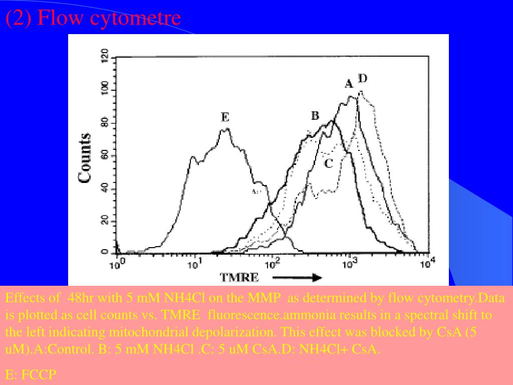 (2) Flow cytometre Effects of 48hr with 5 mM NH4Cl on the MMP as determined by flow cytometry.Data is plotted as cell counts vs. TMRE fluorescence.ammonia results in a spectral shift to the left indicating mitochondrial depolarization. This effect was blocked by CsA (5 uM).A:Control. B: 5 mM NH4Cl .C: 5 uM CsA.D: NH4Cl+ CsA. E: FCCP