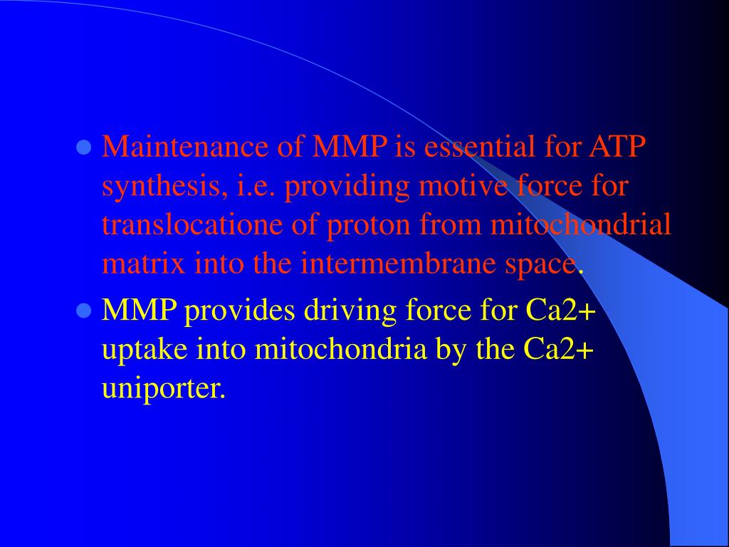 Maintenance of MMP is essential for ATP synthesis, i.e. providing motive force for translocatione of proton from mitochondrial matrix into the intermembrane space. • MMP provides driving force for Ca2+ uptake into mitochondria by the Ca2+ uniporter.