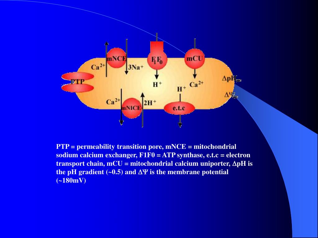 PTP = permeability transition pore, mNCE = mitochondrial sodium calcium exchanger, F1F0 = ATP synthase, e.t.c = electron transport chain, mCU = mitochondrial calcium uniporter, DpH is the pH gradient (~0.5) and DY is the membrane potential (~180mV)