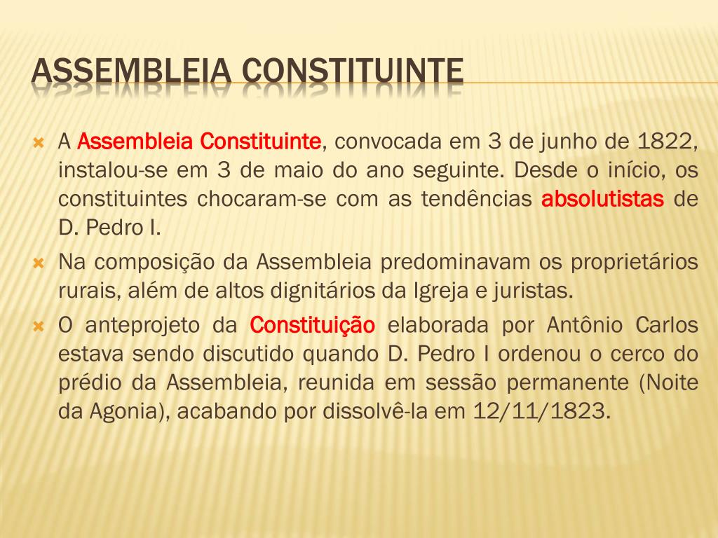 A Assembleia Constituinte, convocada em 3 de junho de 1822, instalou-se em 3 de maio do ano seguinte. Desde o início, os constituintes chocaram-se com as tendências absolutistas de D. Pedro I. Na composição da Assembleia predominavam os proprietários rurais, além de altos dignitários da Igreja e juristas. O anteprojeto da Constituição elaborada por Antônio Carlos estava sendo discutido quando D. Pedro I ordenou o cerco do prédio da Assembleia, reunida em sessão permanente (Noite da Agonia), acabando por dissolvê-la em 12/11/1823. Assembleia constituinte