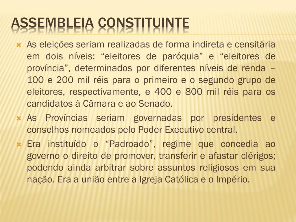 As eleições seriam realizadas de forma indireta e censitária em dois níveis: “eleitores de paróquia” e “eleitores de província”, determinados por diferentes níveis de renda – 100 e 200 mil réis para o primeiro e o segundo grupo de eleitores, respectivamente, e 400 e 800 mil réis para os candidatos à Câmara e ao Senado. As Províncias seriam governadas por presidentes e conselhos nomeados pelo Poder Executivo central. Era instituído o “Padroado”, regime que concedia ao governo o direito de promover, transferir e afastar clérigos; podendo ainda arbitrar sobre assuntos religiosos em sua nação. Era a união entre a Igreja Católica e o Império. Assembleia constituinte