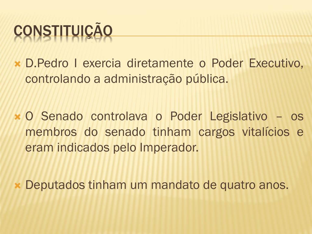D.Pedro I exercia diretamente o Poder Executivo, controlando a administração pública. • O Senado controlava o Poder Legislativo – os membros do senado tinham cargos vitalícios e eram indicados pelo Imperador. • Deputados tinham um mandato de quatro anos. Constituição