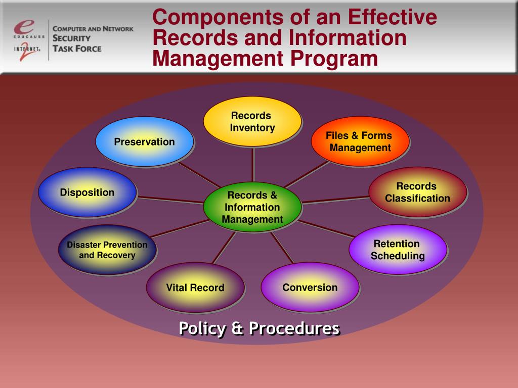 Records Inventory Files & Forms Management Preservation Records Classification Disposition Records & Information Management Retention Scheduling Disaster Prevention and Recovery Conversion Vital Record Components of an EffectiveRecords and InformationManagement Program Policy&Procedures