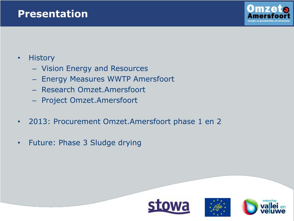 Presentation History Vision Energy and Resources Energy Measures WWTP Amersfoort Research Omzet.Amersfoort Project Omzet.Amersfoort 2013: Procurement Omzet.Amersfoort phase 1 en 2 Future: Phase 3 Sludge drying