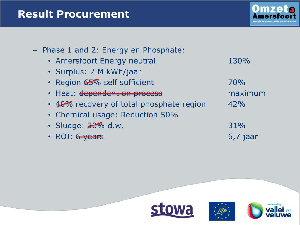 ResultProcurement Phase 1 and 2: Energy en Phosphate: Amersfoort Energy neutral 130% Surplus: 2 M kWh/jaar Region 65% self sufficient 70% Heat: dependent on process maximum 40% recovery of total phosphate region 42% Chemical usage: Reduction 50% Sludge: 30% d.w. 31% ROI: 6 years 6,7 jaar