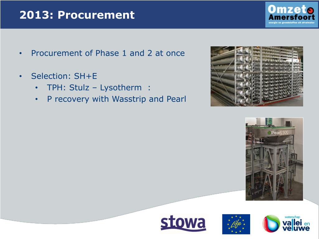 2013: Procurement • Procurement of Phase 1 and 2 at once • Selection: SH+E • TPH: Stulz – Lysotherm : • P recoverywith Wasstrip and Pearl