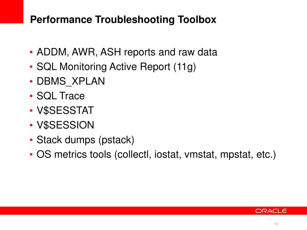 Performance Troubleshooting Toolbox • ADDM, AWR, ASH reports and raw data • SQL Monitoring Active Report (11g) • DBMS_XPLAN • SQL Trace • V$SESSTAT • V$SESSION • Stack dumps (pstack) • OS metrics tools (collectl, iostat, vmstat, mpstat, etc.)