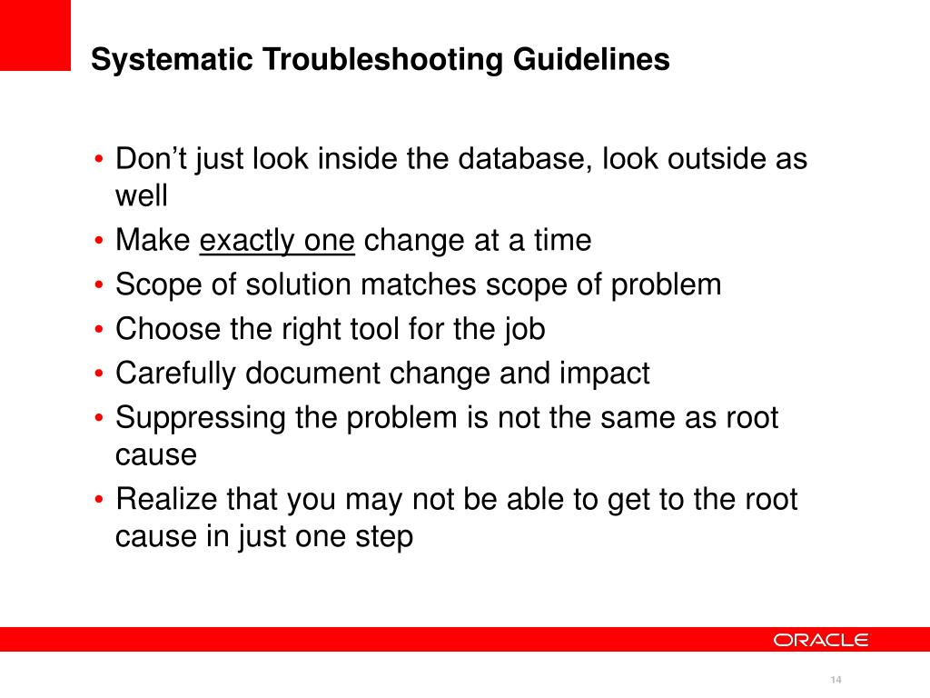 Systematic Troubleshooting Guidelines • Don’t just look inside the database, look outside as well • Make exactly one change at a time • Scope of solution matches scope of problem • Choose the right tool for the job • Carefully document change and impact • Suppressing the problem is not the same as root cause • Realize that you may not be able to get to the root cause in just one step