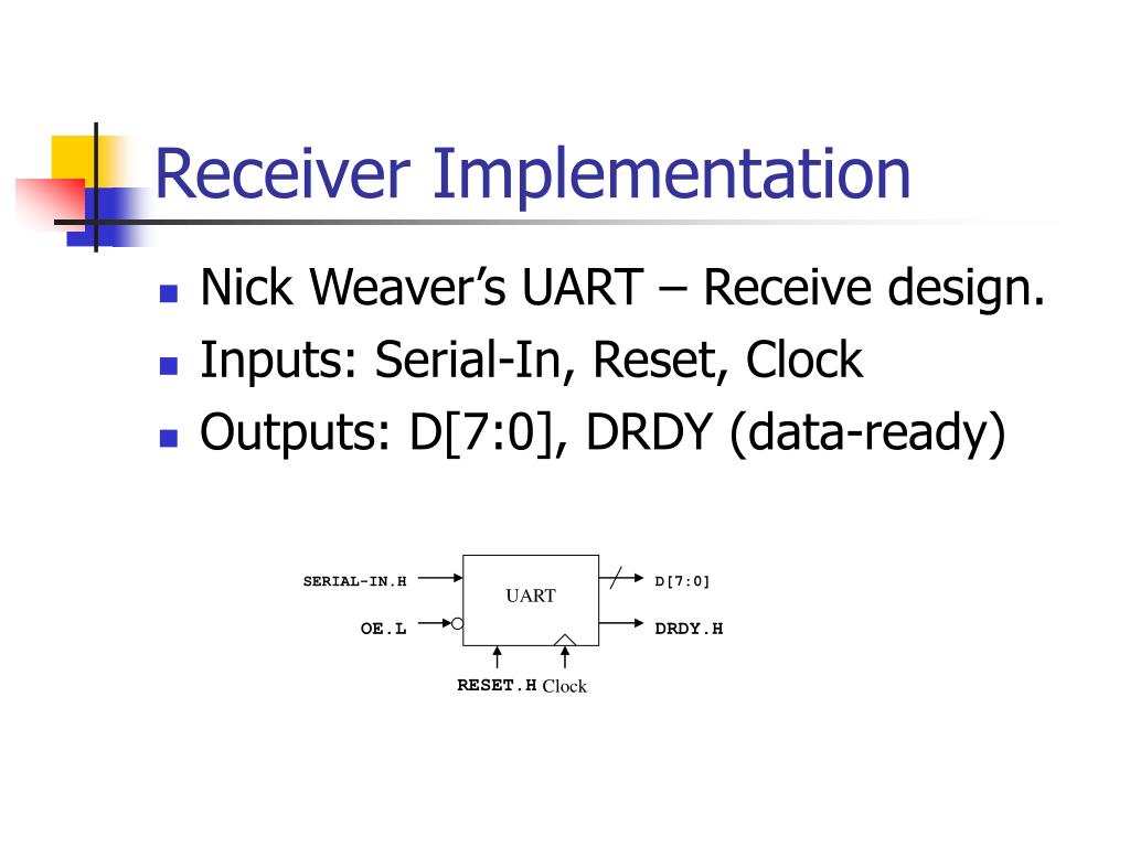UART SERIAL-IN.H D[7:0] OE.L DRDY.H RESET.H Clock Receiver Implementation • Nick Weaver’s UART – Receive design. • Inputs: Serial-In, Reset, Clock • Outputs: D[7:0], DRDY (data-ready)