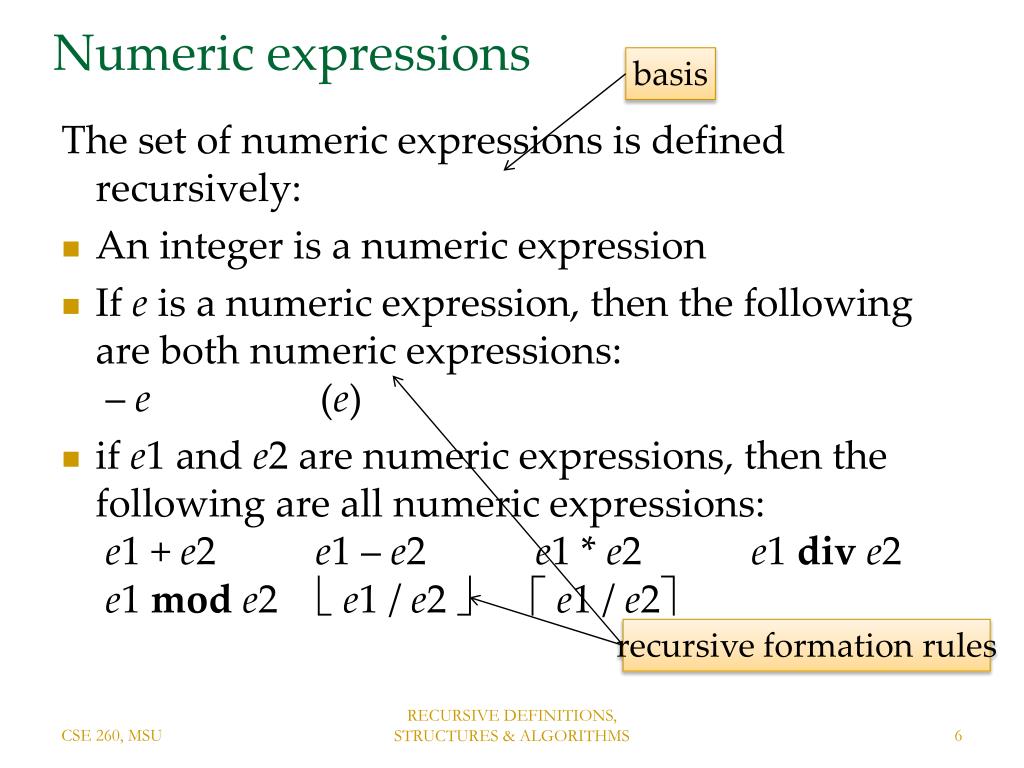 Numeric expressions basis The set of numeric expressions is defined recursively: • An integer is a numeric expression • If e is a numeric expression, then the following are both numeric expressions: – e (e) • if e1 and e2 are numeric expressions, then the following are all numeric expressions: e1 + e2 e1 – e2 e1 * e2 e1 dive2 e1 mode2 e1 / e2 e1 / e2 recursive formation rules RECURSIVE DEFINITIONS, STRUCTURES & ALGORITHMS