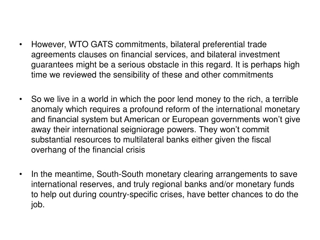 However, WTO GATS commitments, bilateral preferential trade agreements clauses on financial services, and bilateral investment guarantees might be a serious obstacle in this regard. It is perhaps high time we reviewed the sensibility of these and other commitments • So we live in a world in which the poor lend money to the rich, a terrible anomaly which requires a profound reform of the international monetary and financial system but American or European governments won’t give away their international seignioragepowers. They won’t commit substantial resources to multilateral banks either given the fiscal overhang of the financial crisis • In the meantime, South-South monetary clearing arrangements to save international reserves, and truly regional banks and/or monetary funds to help out during country-specific crises, have better chances to do the job.