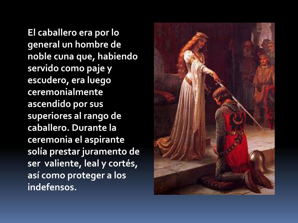 El caballero era por lo general un hombre de noble cuna que, habiendo servido como paje y escudero, era luego ceremonialmente ascendido por sus superiores al rango de caballero. Durante la ceremonia el aspirante solía prestar juramento de ser valiente, leal y cortés, así como proteger a los indefensos.