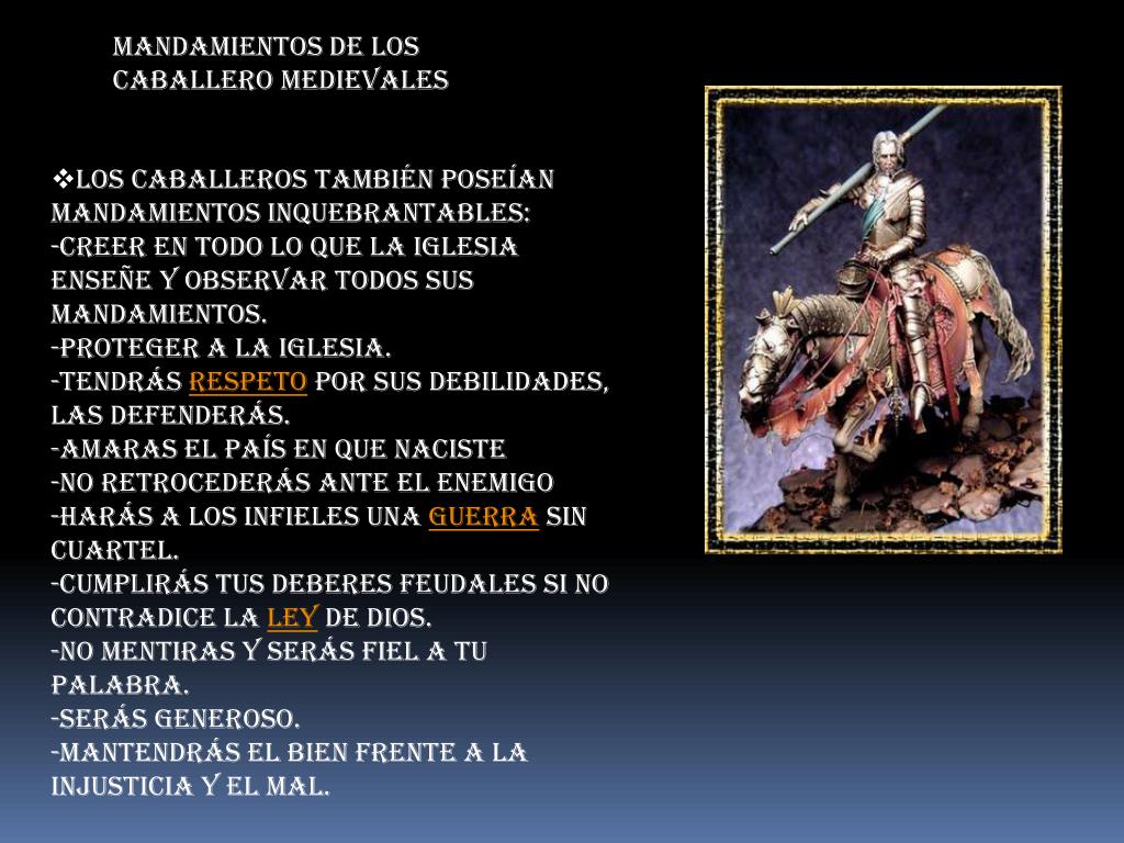 Mandamientos de los • Caballero Medievales • Los caballeros también poseían mandamientos inquebrantables: • -Creer en todo lo que la iglesia enseñe y observar todos sus mandamientos. • -Proteger a la iglesia. • -Tendrás respeto por sus debilidades, las defenderás. • -Amaras el país en que naciste • -No retrocederás ante el enemigo • -Harás a los infieles una guerra sin cuartel. • -cumplirás tus deberes feudales si no contradice la ley de Dios. • -No mentiras y serás fiel a tu palabra. • -Serás generoso. • -Mantendrás el bien frente a la injusticia y el mal.