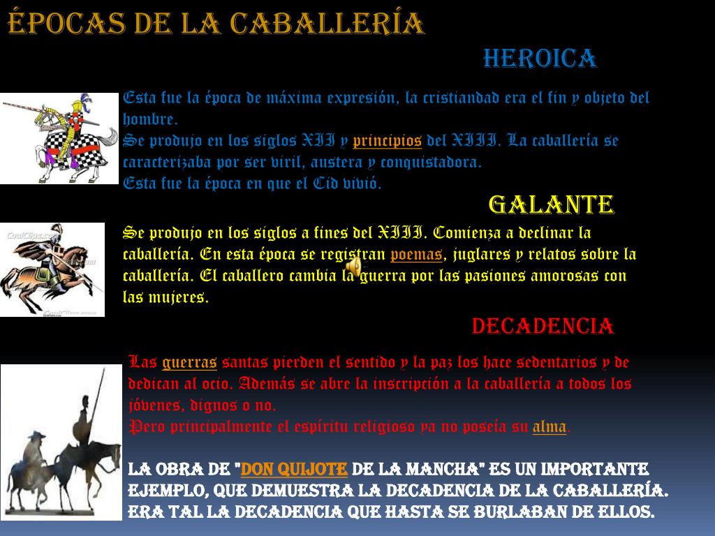 Épocas de la Caballería Heroica Esta fue la época de máxima expresión, la cristiandad era el fin y objeto del hombre. Se produjo en los siglos XII y principios del XIII. La caballería se caracterizaba por ser viril, austera y conquistadora. Esta fue la época en que el Cid vivió. Galante Se produjo en los siglos a fines del XIII. Comienza a declinar la caballería. En esta época se registran poemas, juglares y relatos sobre la caballería. El caballero cambia la guerra por las pasiones amorosas con las mujeres. Decadencia Las guerras santas pierden el sentido y la paz los hace sedentarios y de dedican al ocio. Además se abre la inscripción a la caballería a todos los jóvenes, dignos o no. Pero principalmente el espíritu religioso ya no poseía su alma. La obra de "Don Quijote de la Mancha" es un importante ejemplo, que demuestra la decadencia de la caballería. Era tal la decadencia que hasta se burlaban de ellos.