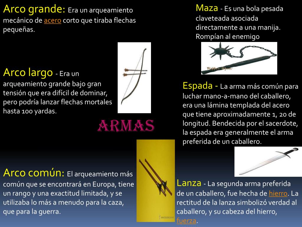 Arco grande: Era un arqueamiento mecánico de acero corto que tiraba flechas pequeñas. Maza - Es una bola pesada claveteada asociada directamente a una manija. Rompían al enemigo Arco largo - Era un arqueamiento grande bajo gran tensión que era difícil de dominar, pero podría lanzar flechas mortales hasta 100 yardas. Espada - La arma más común para luchar mano-a-mano del caballero, era una lámina templada del acero que tiene aproximadamente 1, 20 de longitud. Bendecida por el sacerdote, la espada era generalmente el arma preferida de un caballero. ARMAS Arco común: El arqueamiento más común que se encontrará en Europa, tiene un rango y una exactitud limitada, y se utilizaba lo más a menudo para la caza, que para la guerra. Lanza - La segunda arma preferida de un caballero, fue hecha de hierro. La rectitud de la lanza simbolizó verdad al caballero, y su cabeza del hierro, fuerza.