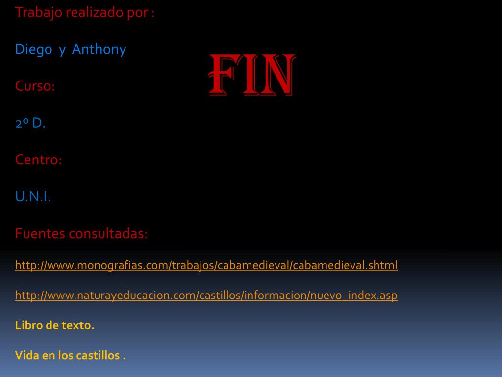 Trabajo realizado por : Diego y Anthony Curso: 2º D. Centro: U.N.I. Fuentes consultadas: http://www.monografias.com/trabajos/cabamedieval/cabamedieval.shtml http://www.naturayeducacion.com/castillos/informacion/nuevo_index.asp Libro de texto. Vida en los castillos . FIN