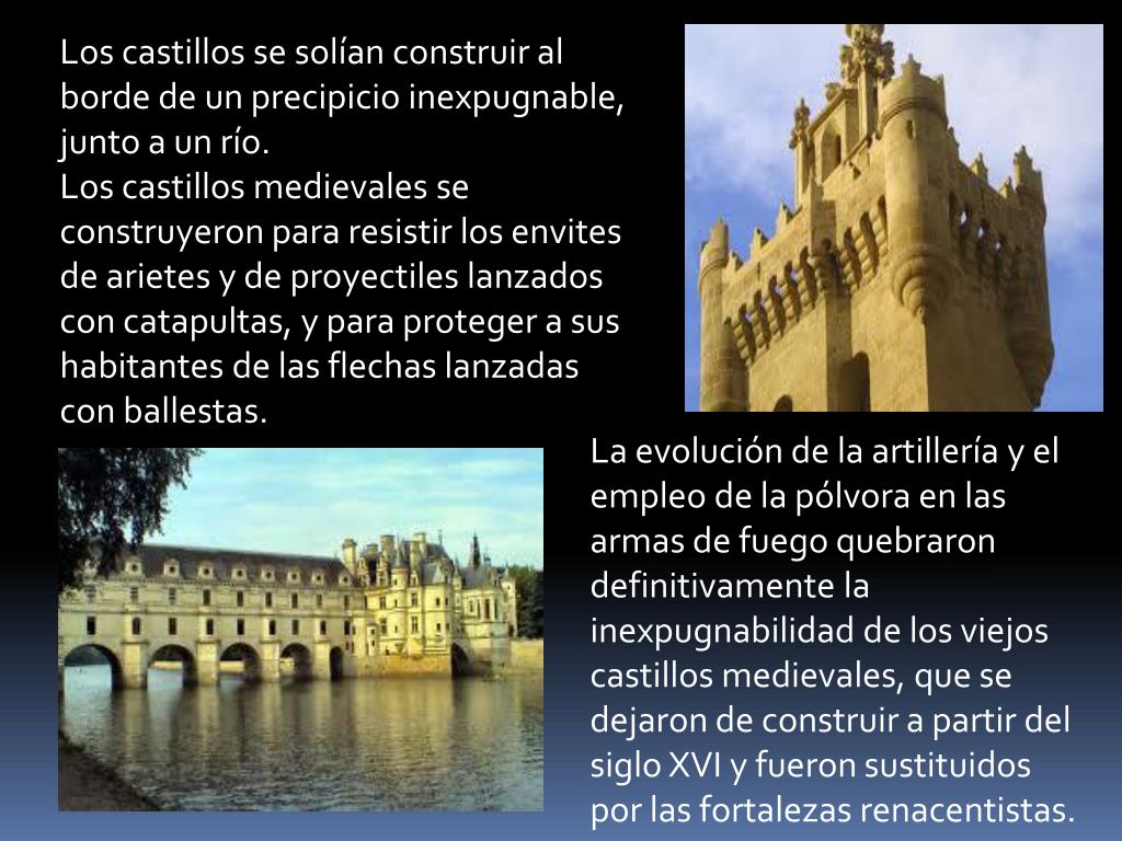Los castillos se solían construir al borde de un precipicio inexpugnable, junto a un río.Los castillos medievales se construyeron para resistir los envites de arietes y de proyectiles lanzados con catapultas, y para proteger a sus habitantes de las flechas lanzadas con ballestas. La evolución de la artillería y el empleo de la pólvora en las armas de fuego quebraron definitivamente la inexpugnabilidad de los viejos castillos medievales, que se dejaron de construir a partir del siglo XVI y fueron sustituidos por las fortalezas renacentistas.