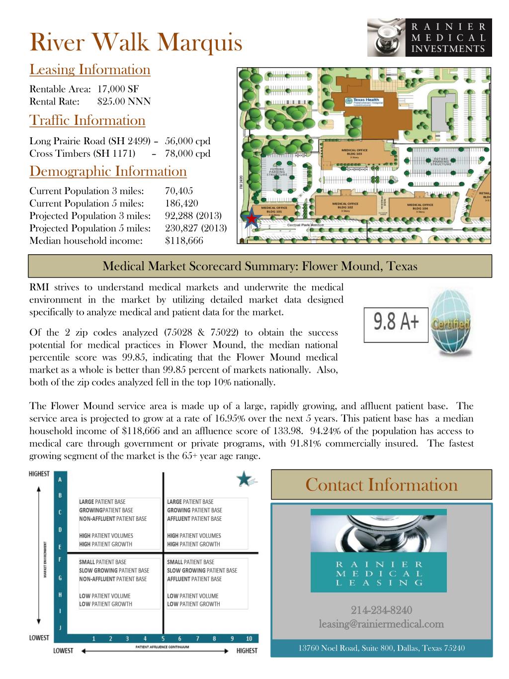River Walk Marquis Leasing Information Rentable Area: 17,000 SF Rental Rate: $25.00 NNN Traffic Information Long Prairie Road (SH 2499) – 56,000 cpd Cross Timbers (SH 1171) – 78,000 cpd Demographic Information Current Population 3 miles: 70,405 Current Population 5 miles: 186,420 Projected Population 3 miles: 92,288 (2013) Projected Population 5 miles: 230,827 (2013) Median household income: $118,666 Medical Market Scorecard Summary: Flower Mound, Texas RMI strives to understand medical markets and underwrite the medical environment in the market by utilizing detailed market data designed specifically to analyze medical and patient data for the market. Of the 2 zip codes analyzed (75028 & 75022) to obtain the success potential for medical practices in Flower Mound, the median national percentile score was 99.85, indicating that the Flower Mound medical market as a whole is better than 99.85 percent of markets nationally. Also, both of the zip codes analyzed fell in the top 10% nationally. The Flower Mound service area is made up of a large, rapidly growing, and affluent patient base. The service area is projected to grow at a rate of 16.95% over the next 5 years. This patient base has a median household income of $118,666 and an affluence score of 133.98. 94.24% of the population has access to medical care through government or private programs, with 91.81% commercially insured. The fastest growing segment of the market is the 65+ year age range. Contact Information 214-234-8240 leasing@rainiermedical.com 13760 Noel Road, Suite 800, Dallas, Texas 75240