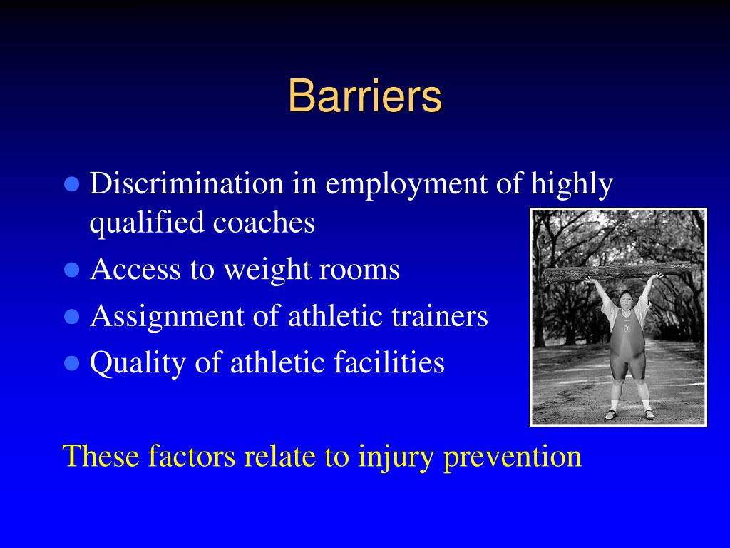 Barriers • Discrimination in employment of highly qualified coaches • Access to weight rooms • Assignment of athletic trainers • Quality of athletic facilities These factors relate to injury prevention