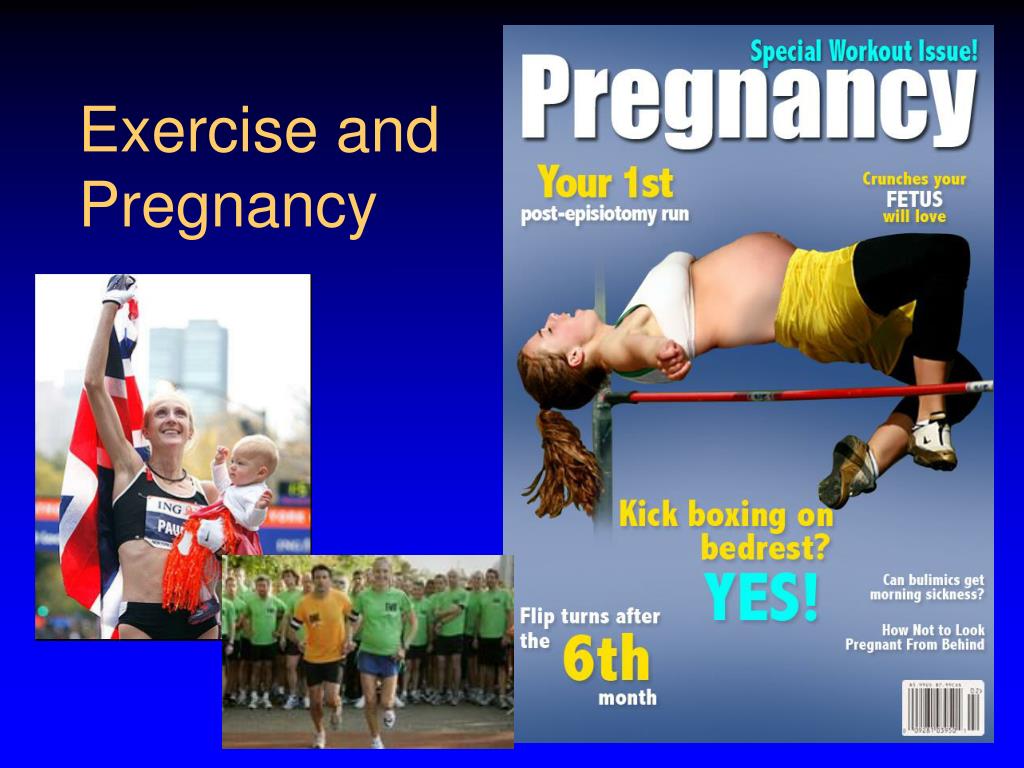 Exercise and Pregnancy • Years ago it was discouraged • ACOG now actively encourages it— 2002 statement • Concerns included: • increases in body temperature, • stress hormones, • caloric expenditure, • biomechanical stresses • Medical literature does not support this