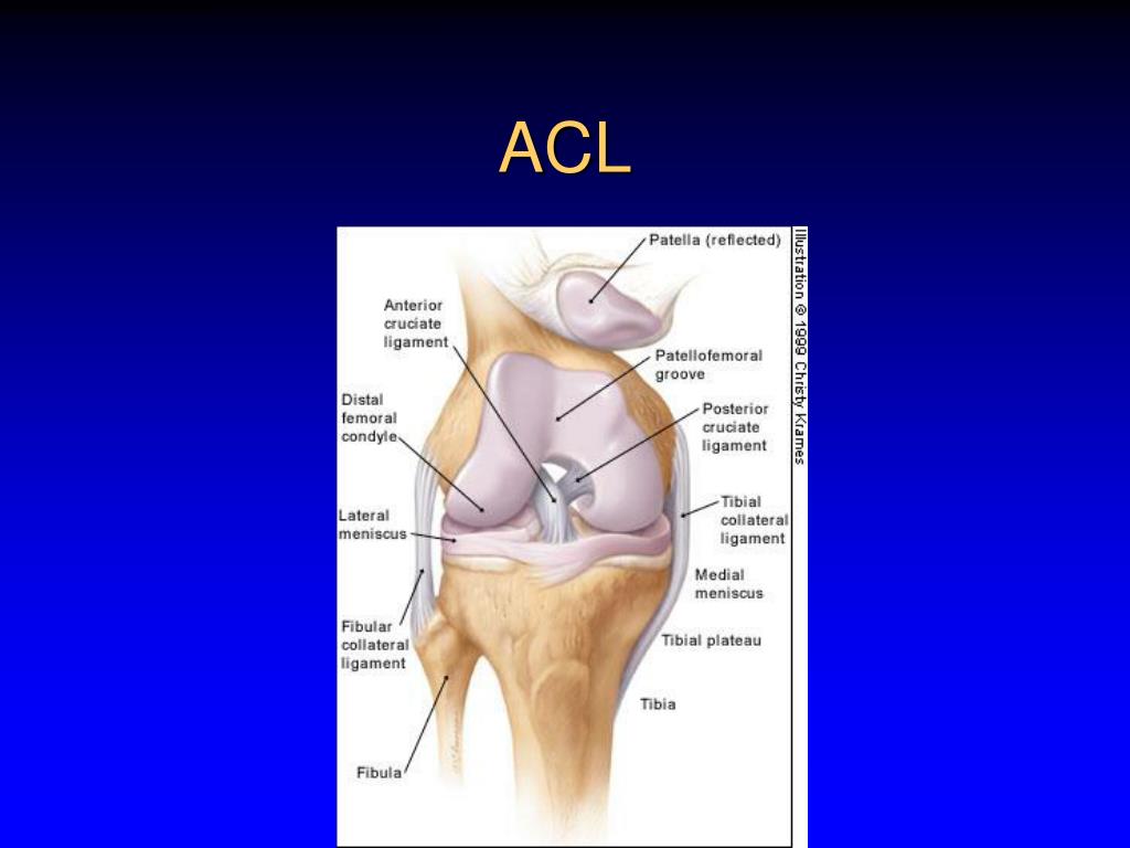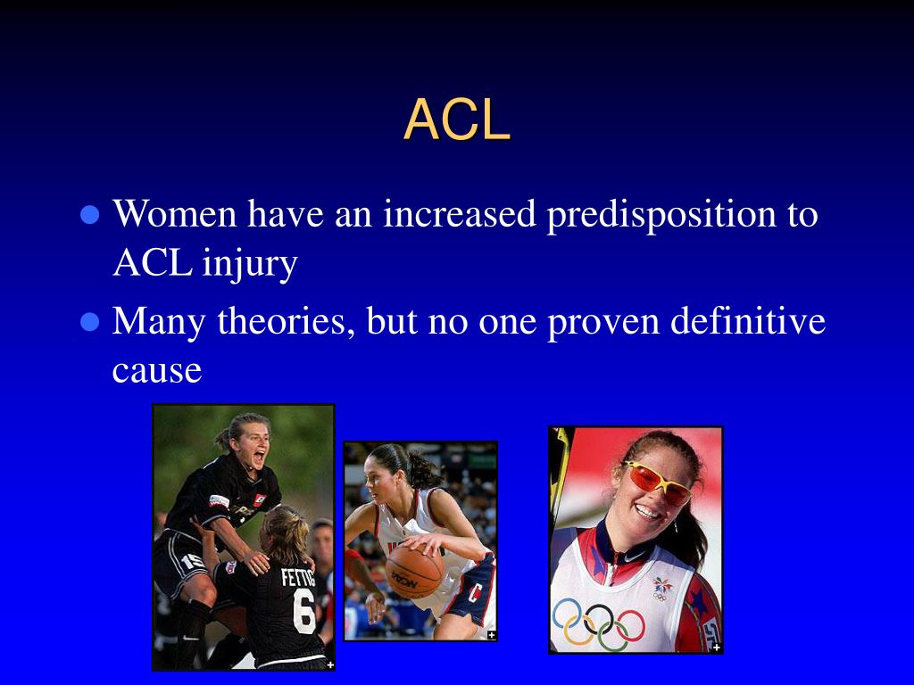 ACL • Women have an increased predisposition to ACL injury • Many theories, but no one proven definitive cause